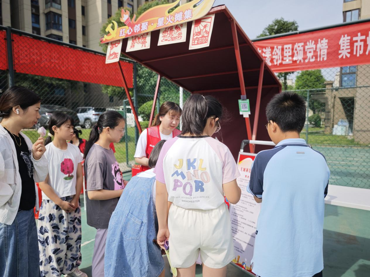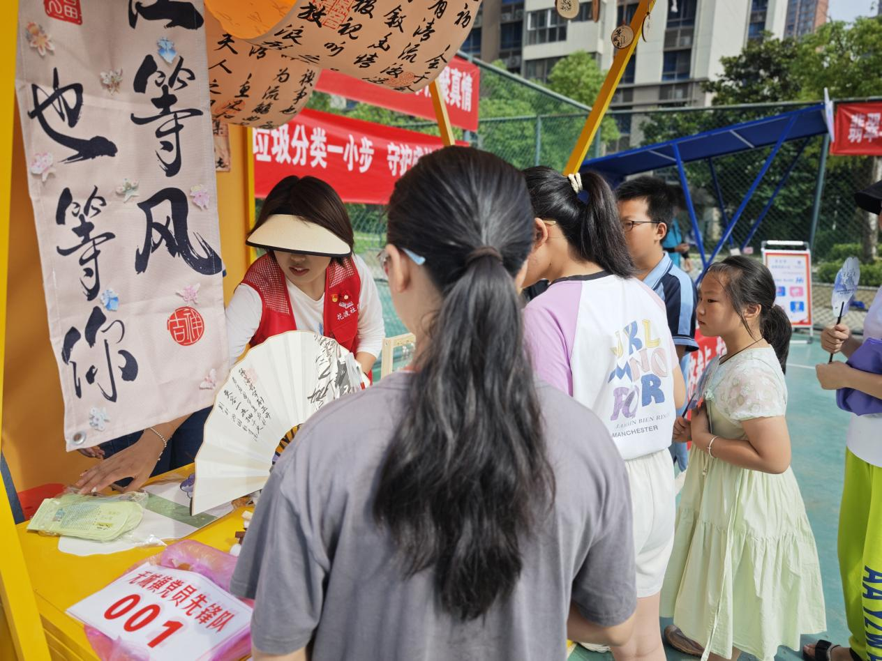本次活动的核心亮点为“花漾集市”,一开市便吸引了众多居民驻足参与。集市内设置的多个特色摊位各有亮点,其中书法文创摊位前,摊位以古朴卷轴为背景,笔墨香与文创气息交织。周围陈列的文创产品既饱含文化底蕴,又传递着社区对民族和谐、邻里友好的美好期许。