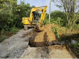 2025年9月14日晚间,包片干部在例行巡查中,发现该处坑洼系因重型车辆碾压及近期雨水冲刷所致。为确保安全,村支书黄喜英第一时间带领两委干部,对坑洼处放入石块预填,在周边设置了醒目的警示标志和路障,并通过村民微信群发布安全提醒,告知村民注意绕行。同时村委会立即启动应急维修程序,当晚联系好施工队,制定好施工方案,并安排村干部第二天值守关键路口,负责劝导村民绕行。