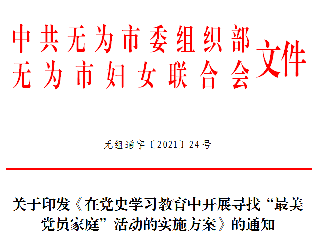 同市委组织部联合开展评选100户“最美党员家庭”活动,推动党史学习教育走深走实。线上利用“无为女性”微信公众号设立“党史学习教育”专栏,已推送专题党史知识14期。