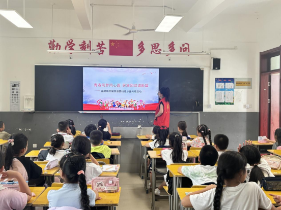 在互动交流环节,志愿者积极鼓励同学们分享自己熟知的民族知识与民俗风情。现场学生踊跃参与、积极发言:有的介绍蒙古族的那达慕大会,有的描述傣族的泼水节,有的分享维吾尔族的歌舞和美食,还有的分享了自己与不同民族同学相处的温暖故事……课堂气氛热烈活跃,在交流中增进了对不同民族的了解,也让“民族团结一家亲”的理念更加深入人心。