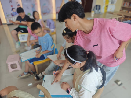 随后,孩子们在童磊的指导下开始动手实践。有的孩子专注地勾勒轮廓,有的孩子认真地涂抹阴影,虽然技法都尚显稚嫩,但每一个孩子都在用心感受绘画的魅力。童磊穿梭在孩子们中间,一对一地指导,带领孩子们一起感受艺术的美好,激发他们的创造力和想象力。