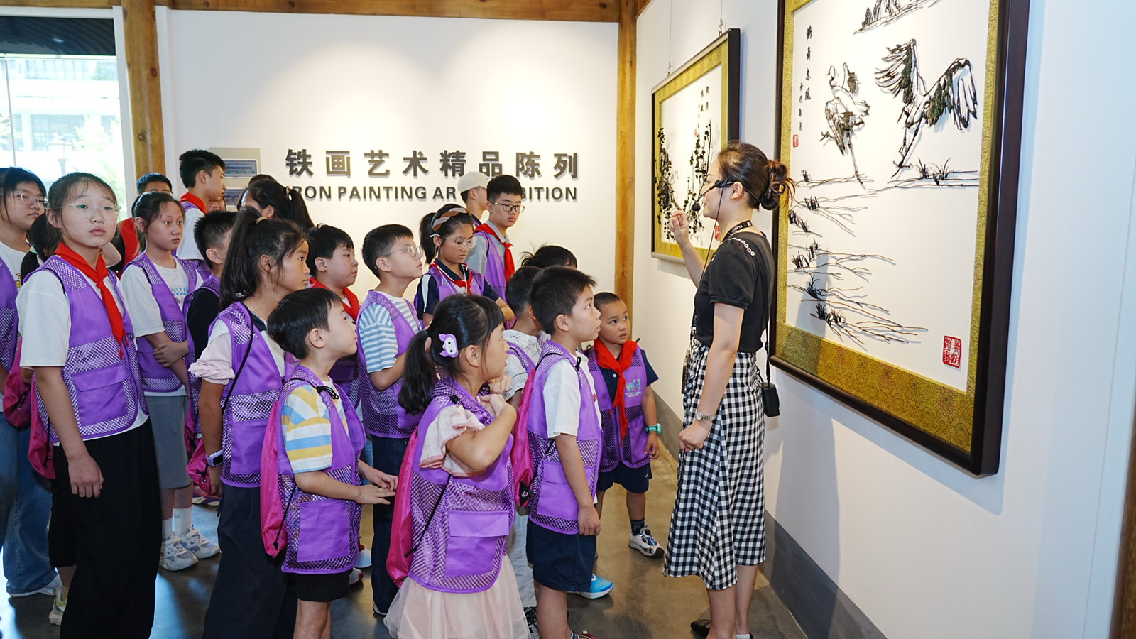 活动第一站走进芜湖铁画博物馆,小朋友们在志愿者老师的带领下了解铁画技艺的历史文化,传承过程,通过一个个精美的铁画工艺品展示和图文作品,深刻认识到铁画不仅是一门艺术,更是时代的见证,小朋友沉浸式感受非遗铁画的内涵和魅力,不禁赞叹工匠们高超技艺。
