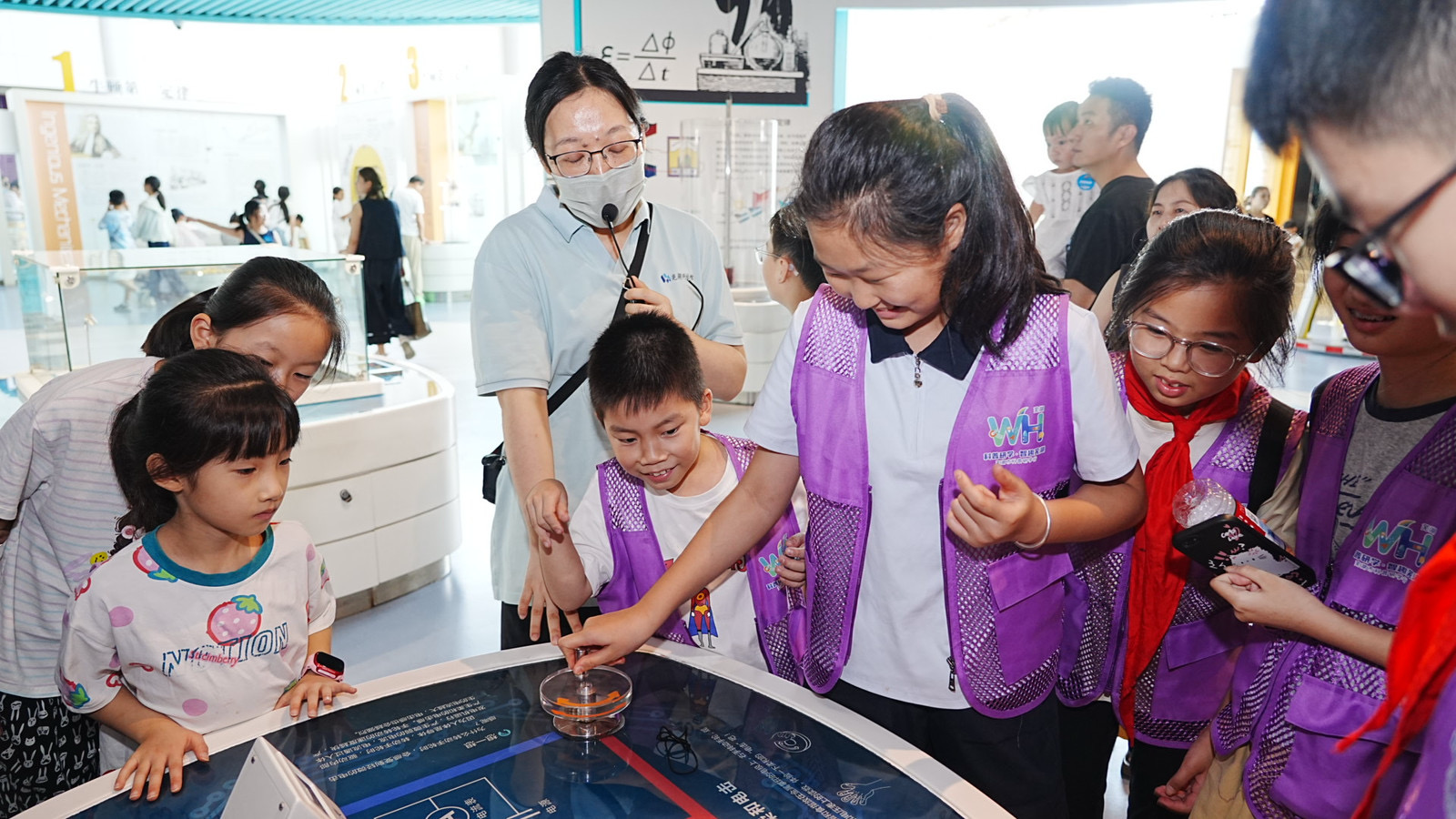 在科普实验环节。老师们带领孩子们参加“万物皆可科学秀实验”。通过怒发冲冠、循环彩带、马德堡半球等互动实验,将科技和魔术相结合,带领孩子上台参加实验,体验科学的奥秘。“我刚才也体验了下静电,全身都好像触电一样,麻麻的感觉,真有趣”